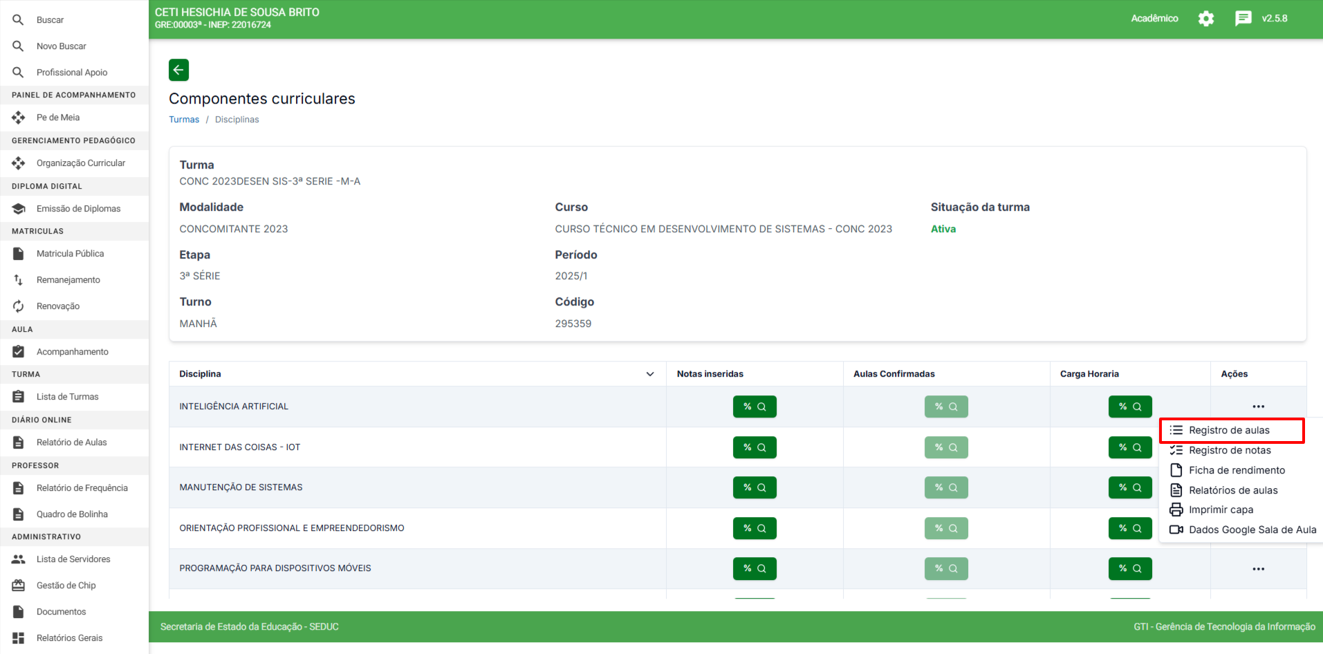 - Na turma desejada, selecione a opção Registro de Aulas.