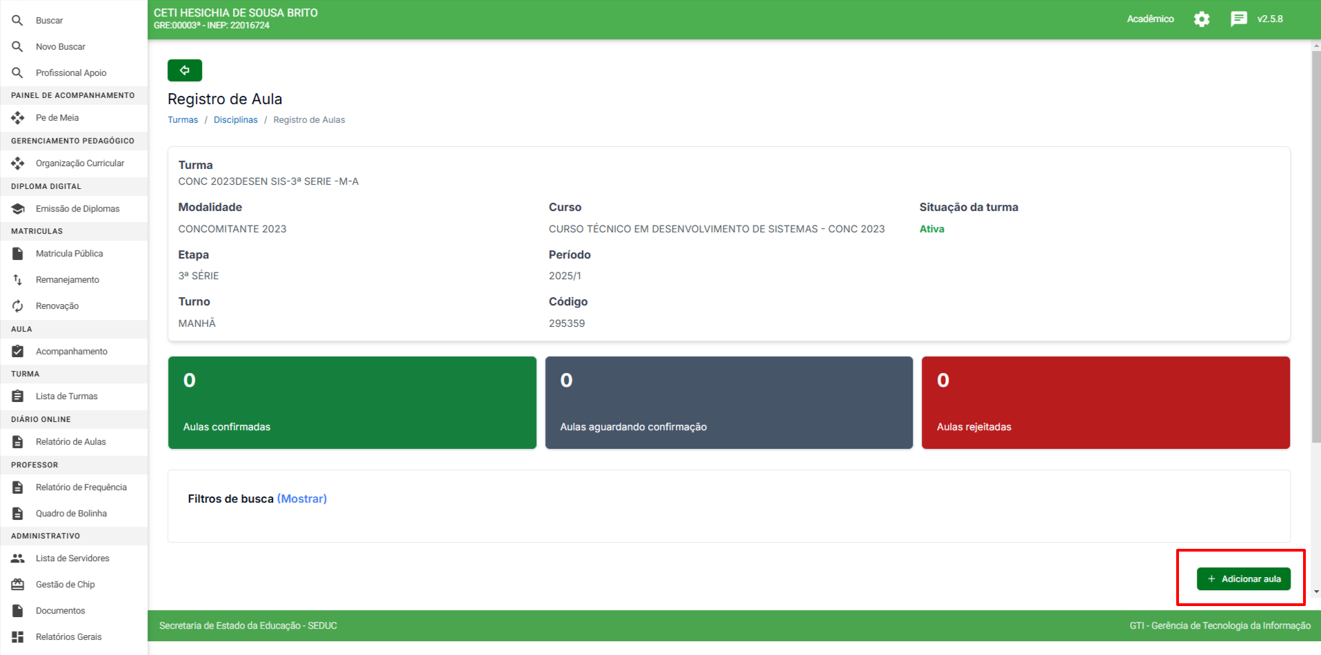 - No menu Registro de Aulas, clique no botão + Adicionar Aula.