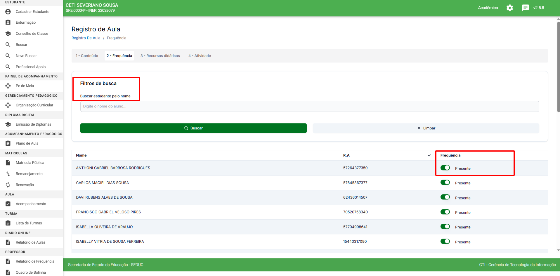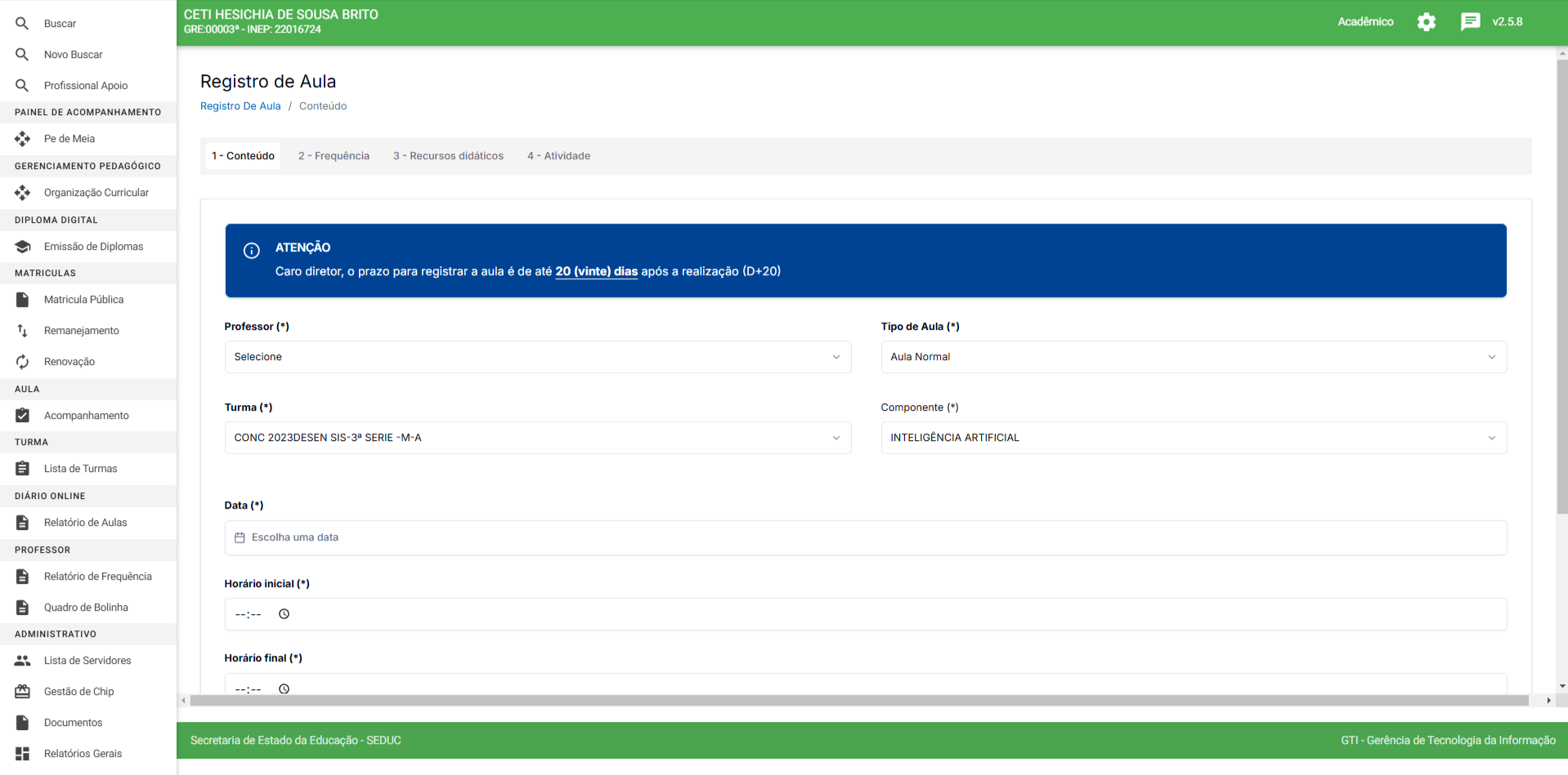- Objetivo: Realizar o registro da aula realizada informando data, horário, conteúdo e frequência