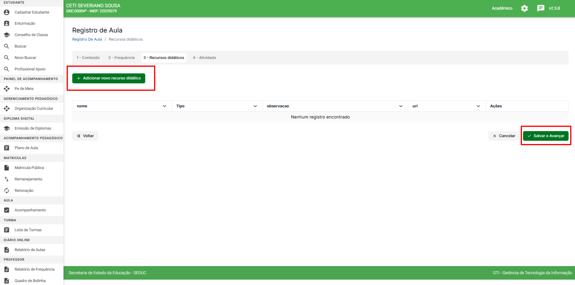 - Para adicionar recursos utilizados na aula, clique no botão + Adicionar Novo Recurso Didático.