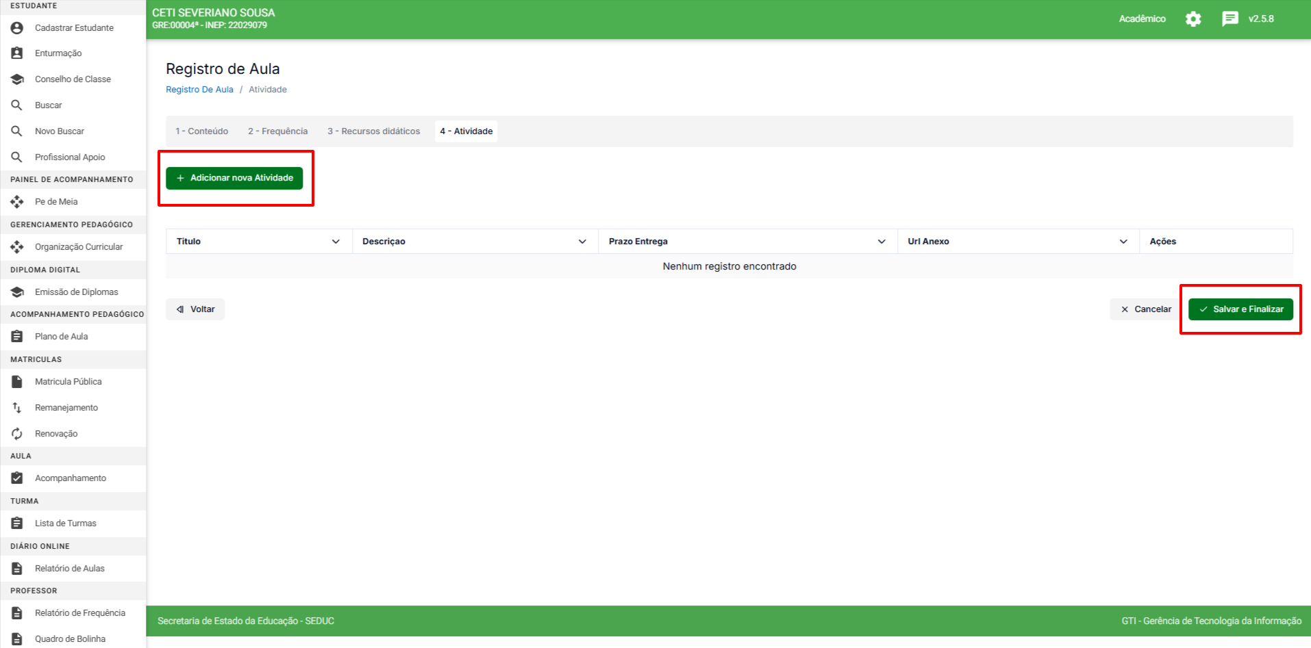 - Clique em Salvar e Finalizar para concluir o registro da aula.