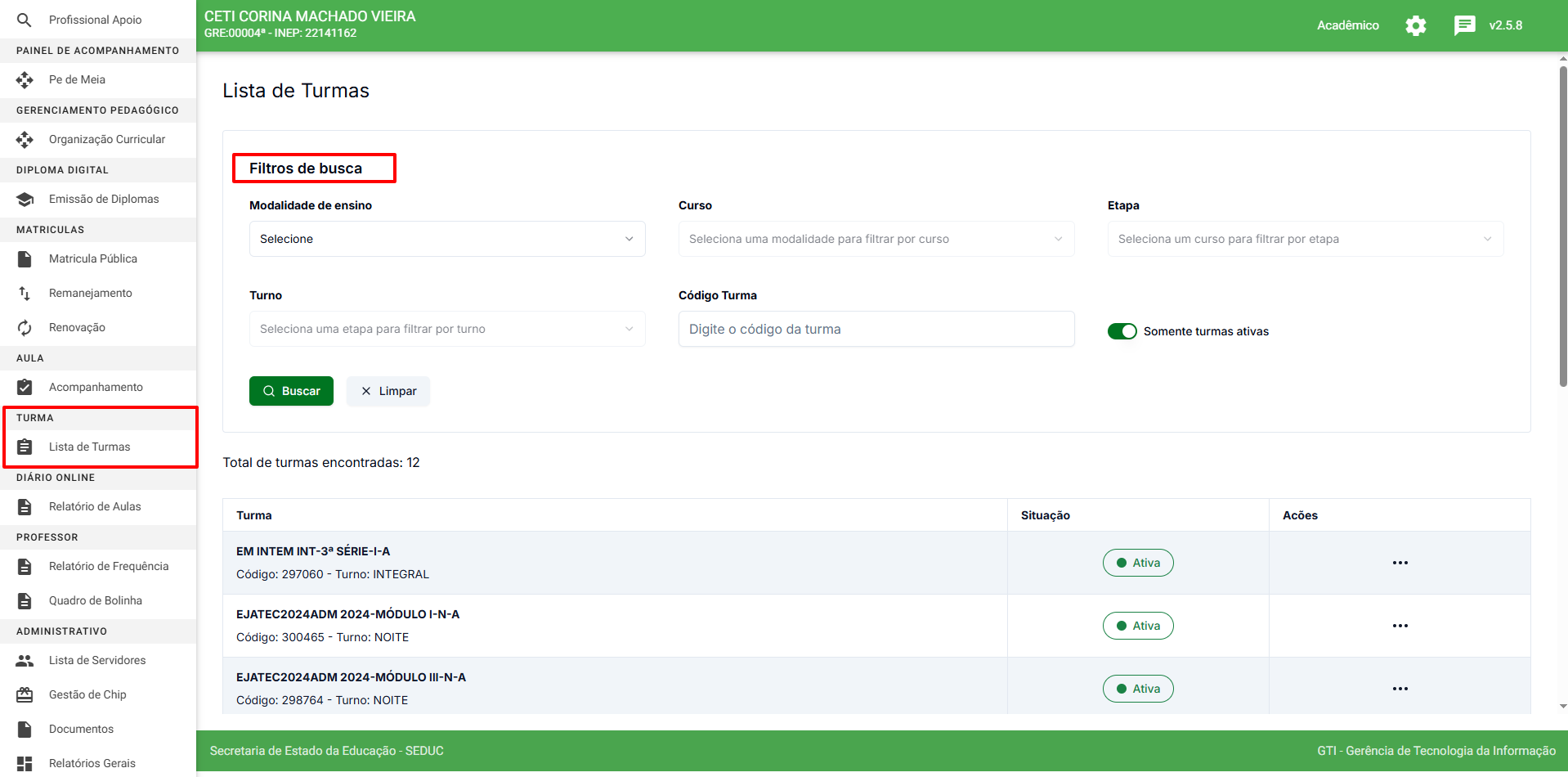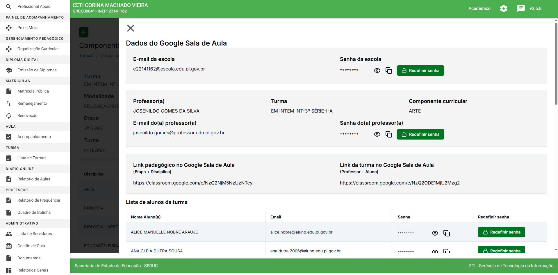 - Objetivo: Verificar os dados da turma, Estudantes e resetar senha de acesso