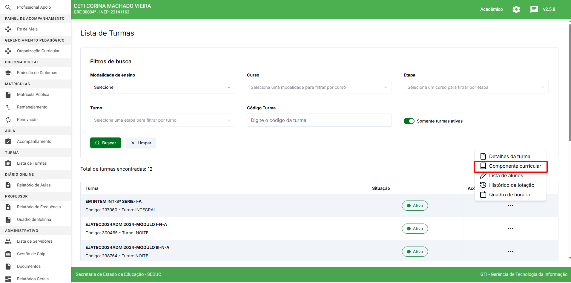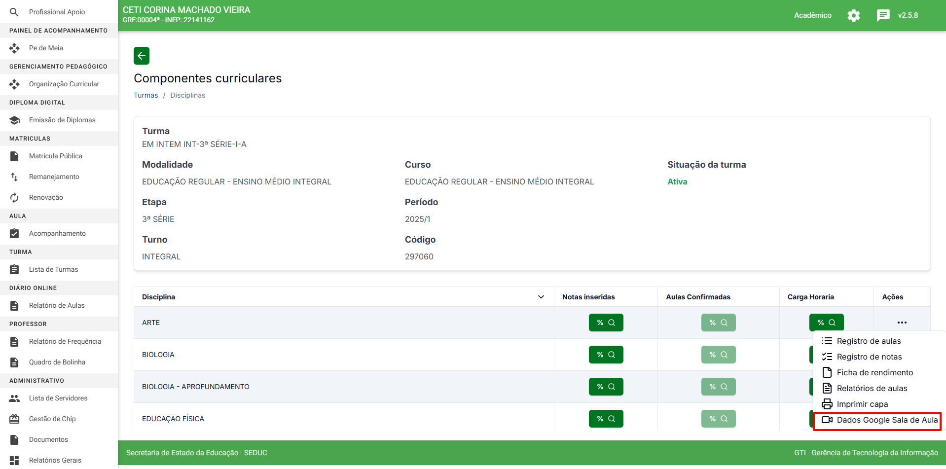 - Menu de Acesso: Entidades > Abrir > Componente Curricular > Google Sala de Aula