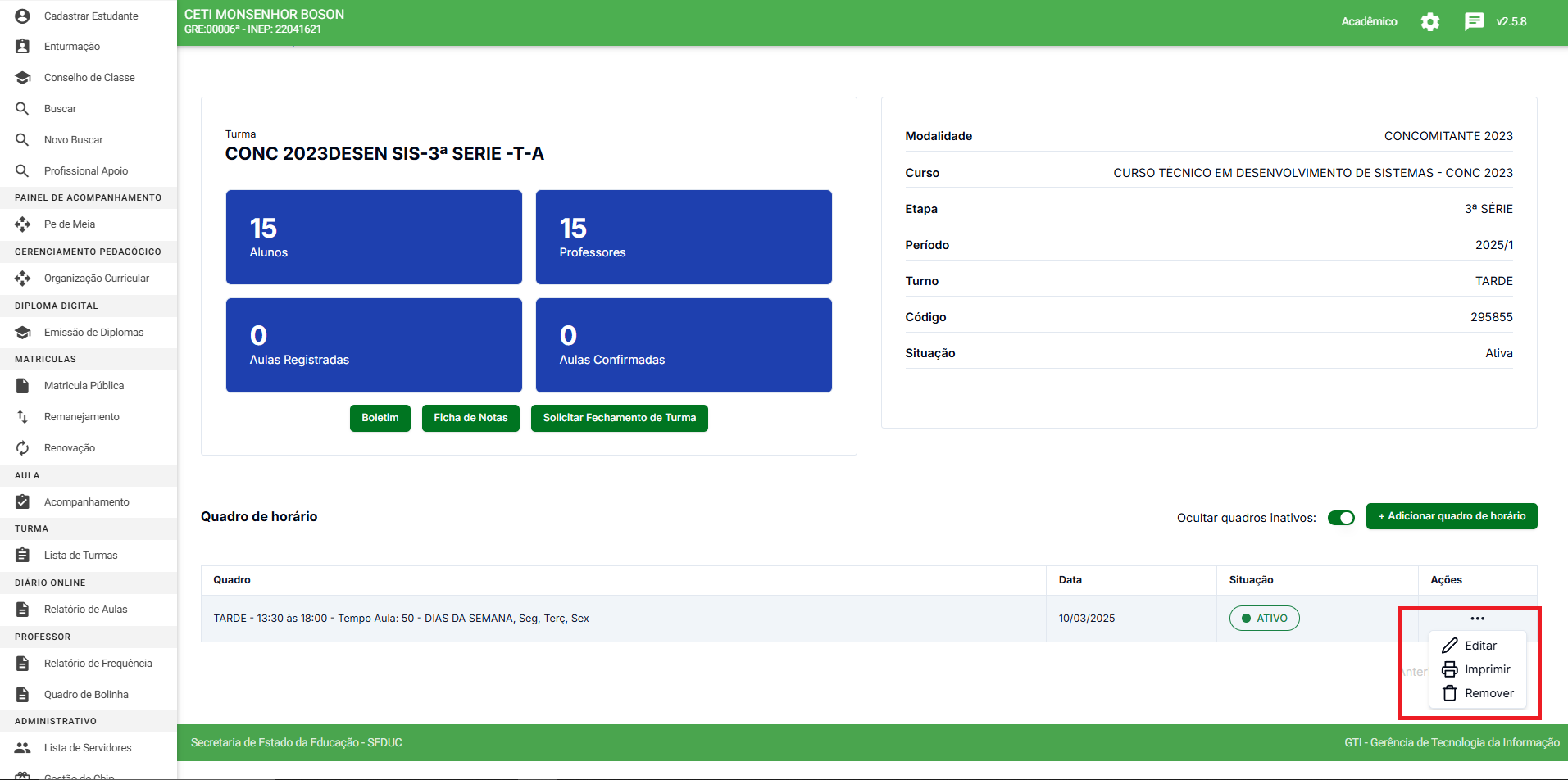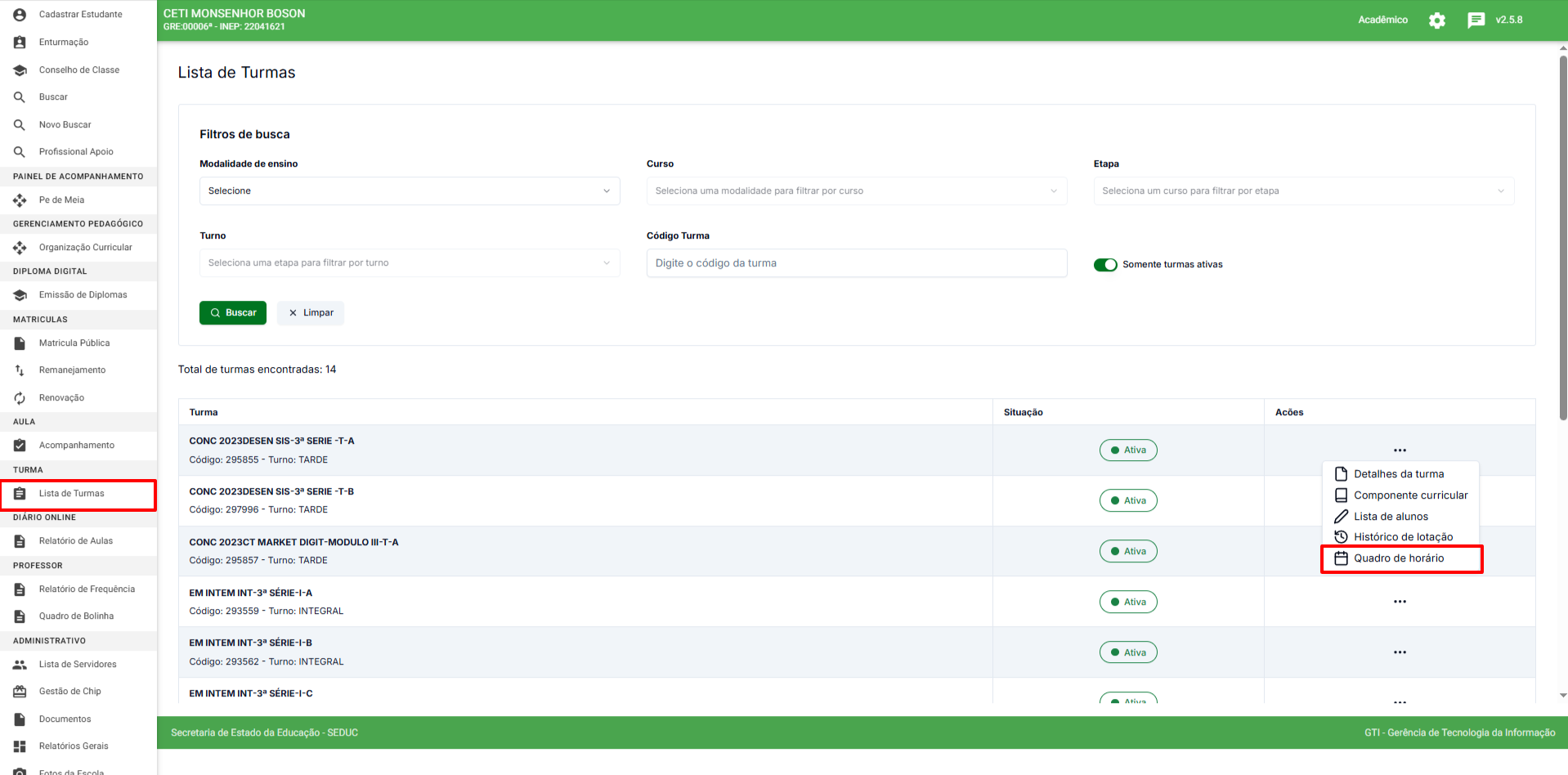 - Escolha a turma desejada e clique na opção “Quadro de Horário”.
