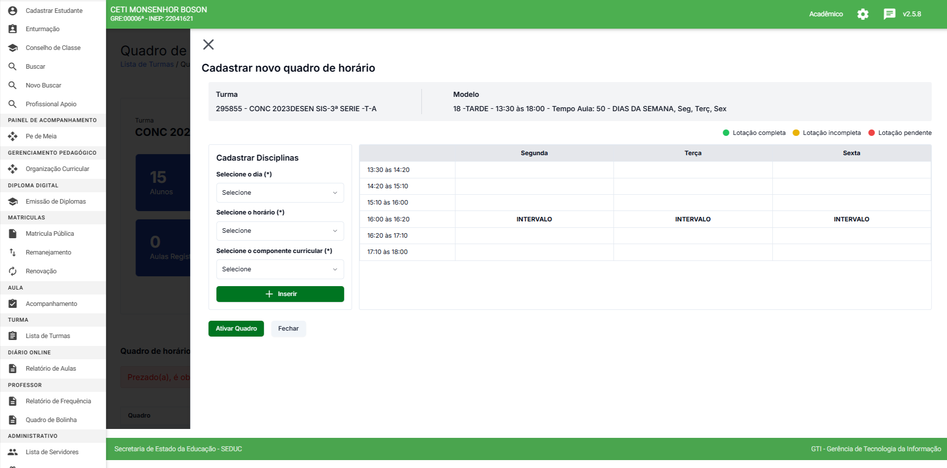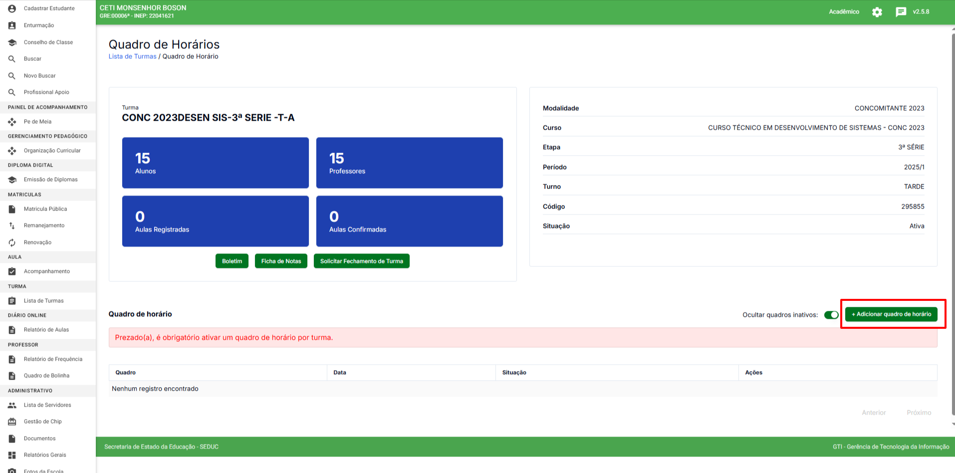 - Menu de Acesso: Lista de Turmas > Quadro de Horário > Adicionar Quadro de Horário