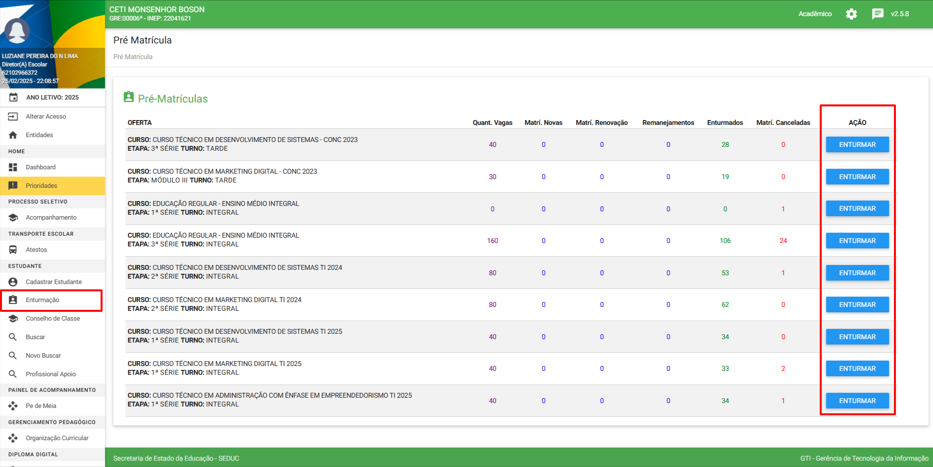 - Certifique-se de que existe uma turma ativa para o ano letivo de 2025 antes de realizar a enturmação.