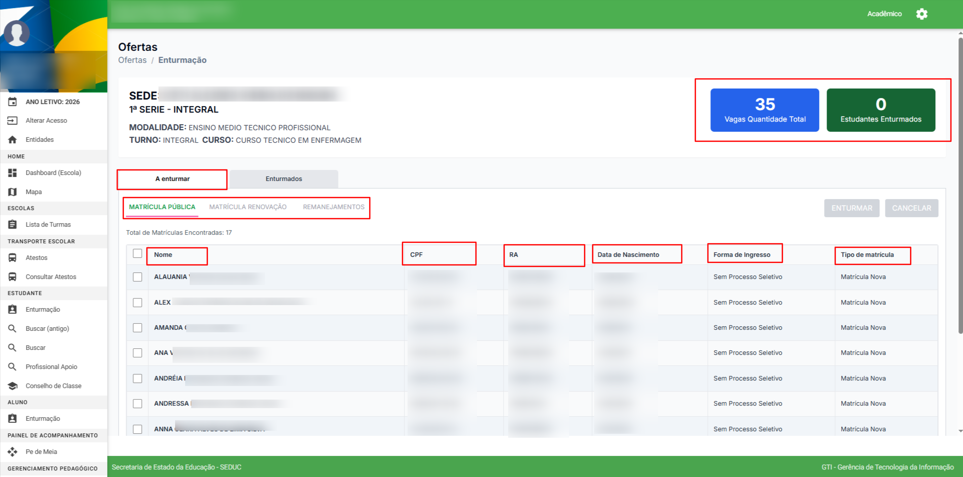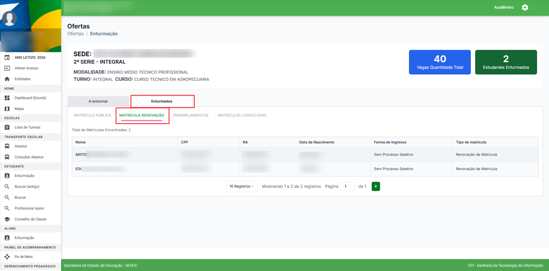 - Estudantes já enturmados, separados por tipo de matrícula;