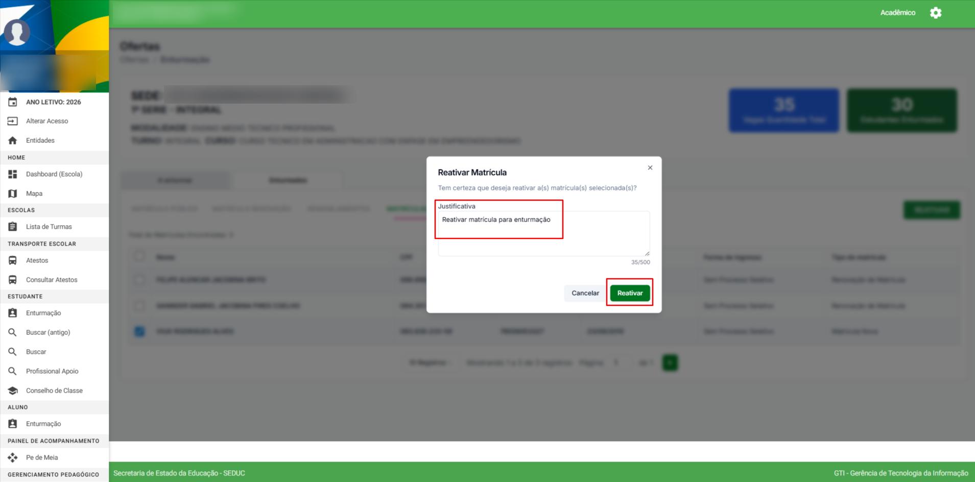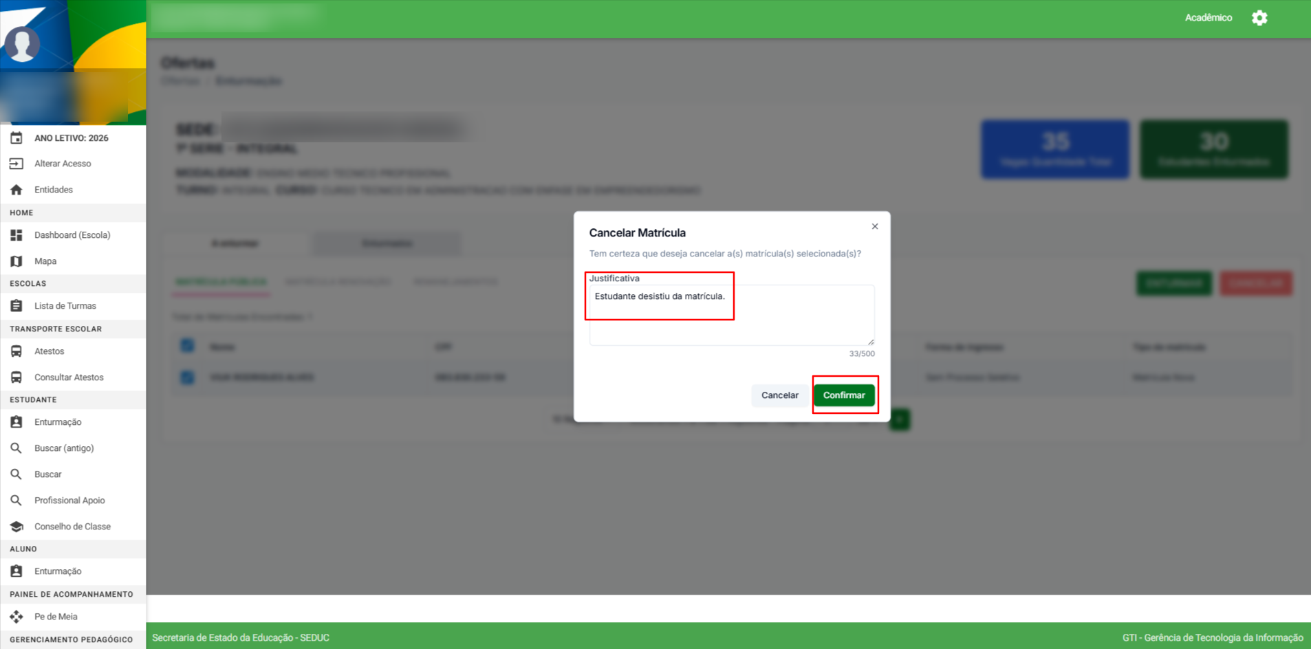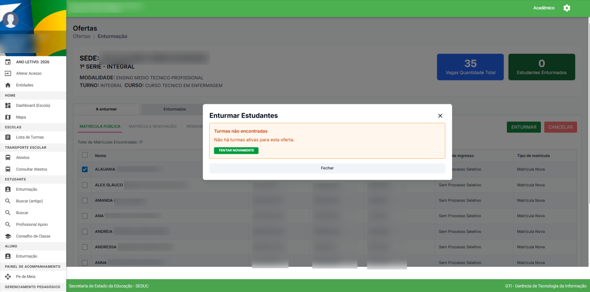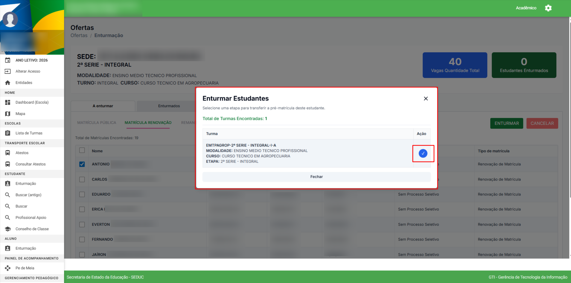 - Confirme a enturmação no alerta de confirmação exibido pelo sistema.