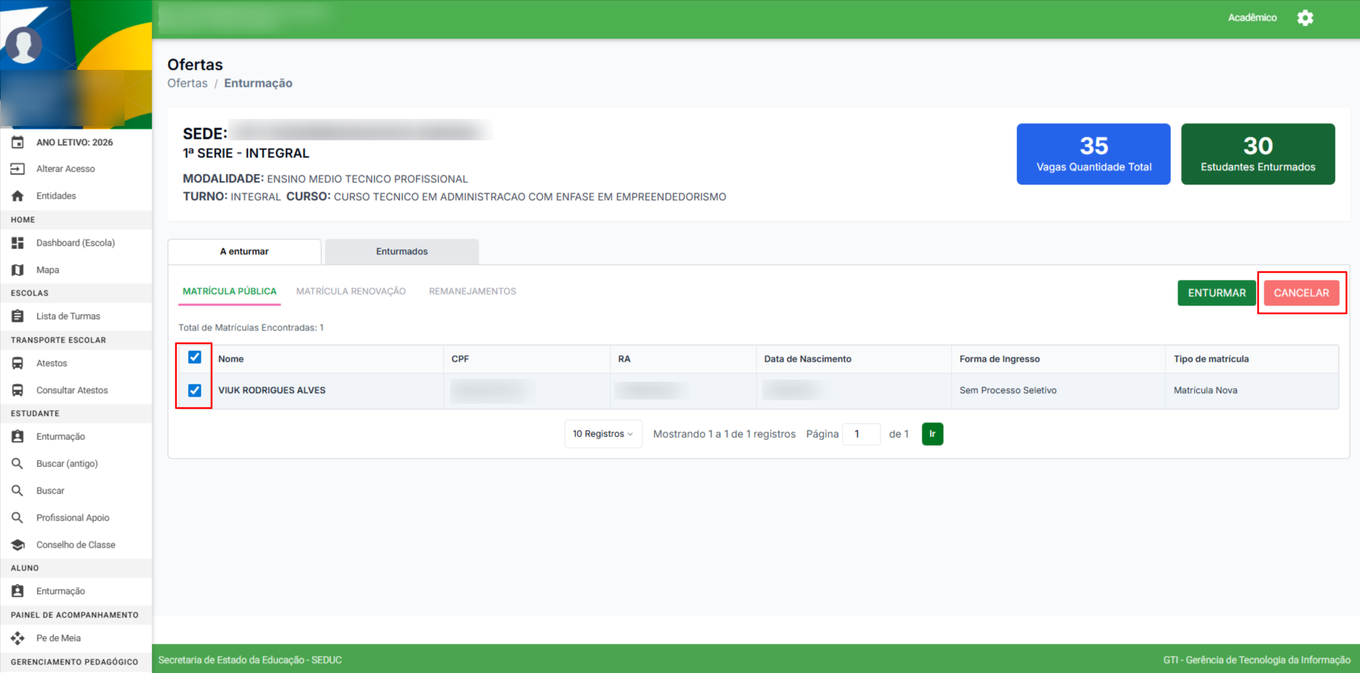 - A matrícula será movida para Enturmados → Matrículas Canceladas.