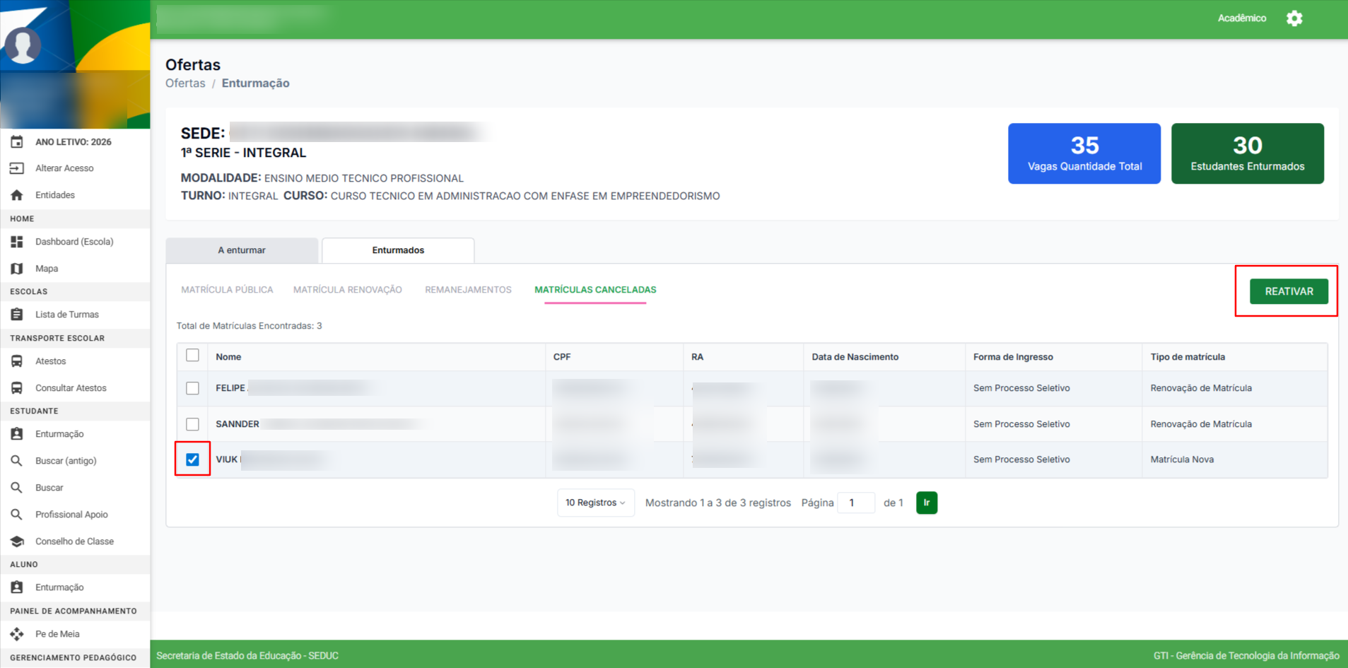 - Aba específica para Matrículas Canceladas, com opção de reativação.