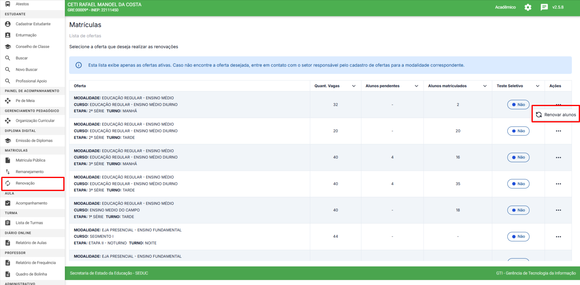 - Dentro do menu Renovação, serão listadas as ofertas ativas. Clique em Ações > Renovar Estudantes.