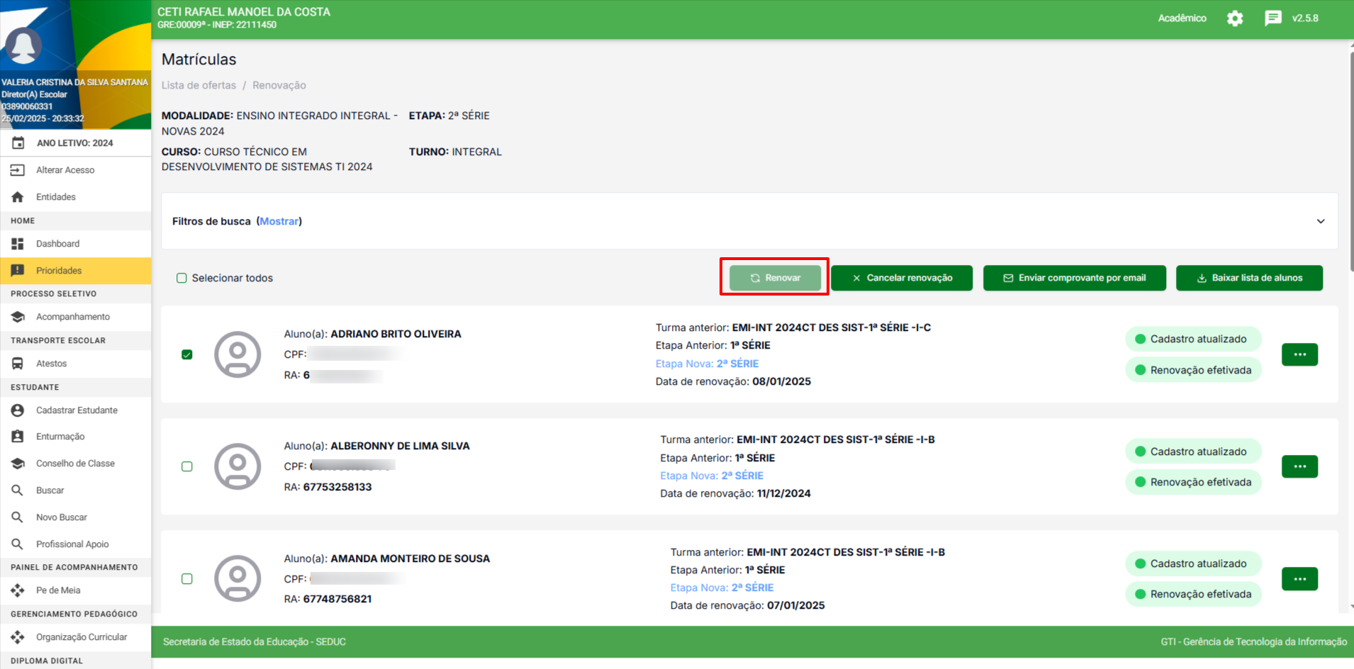 - Com o cadastro atualizado, selecione o estudante e clique em Renovar.