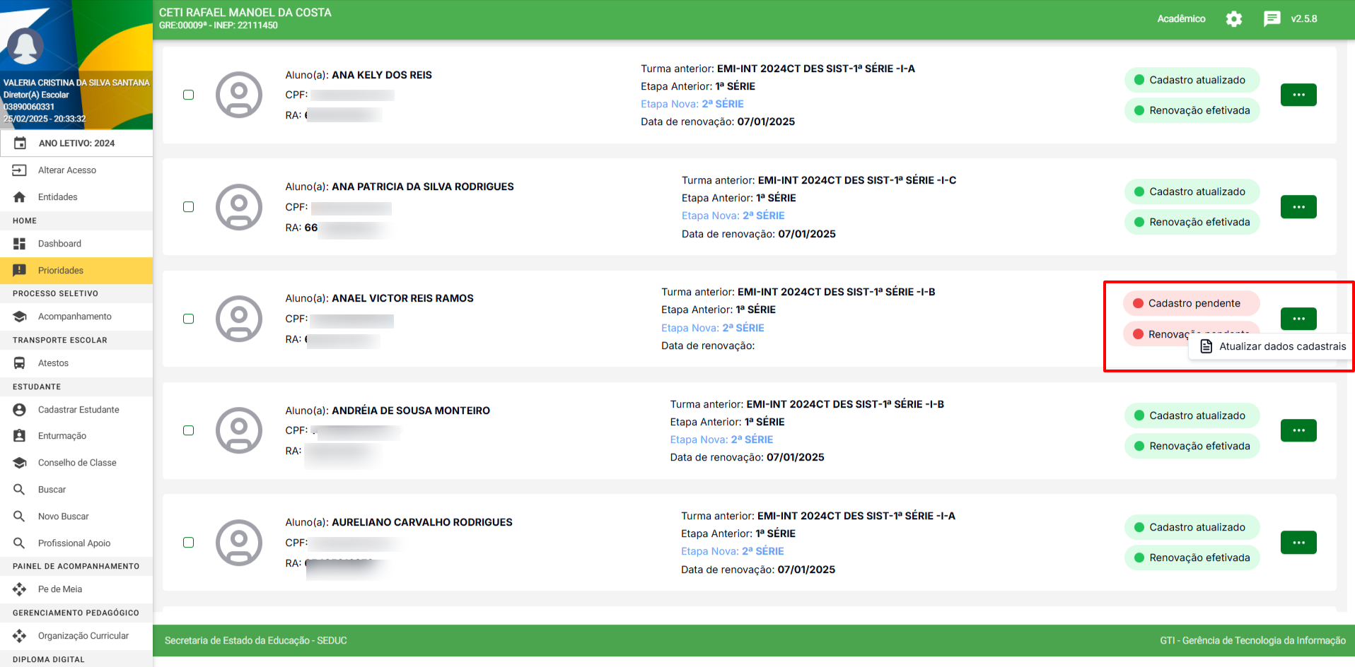 - Selecione um estudante e clique em Atualizar Dados Cadastrais.