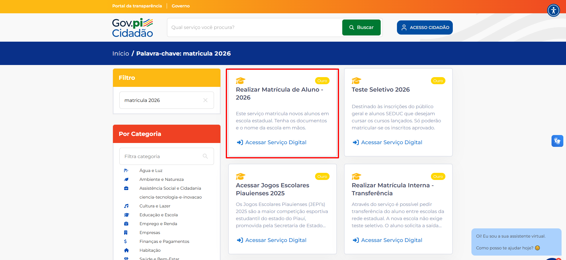 Após o login, volte à página inicial do Gov.PI Cidadão e pesquise pelo serviço “Matrícula”.