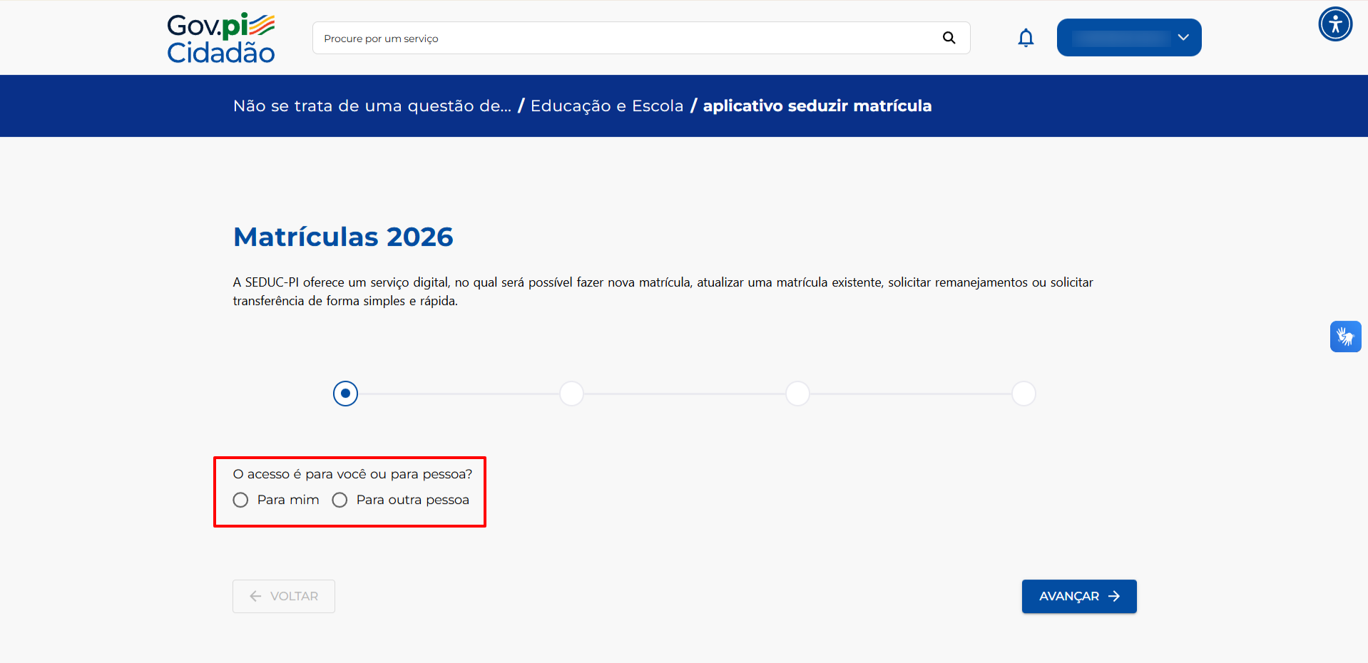 O sistema perguntará se a matrícula será feita para você ou para outra pessoa.