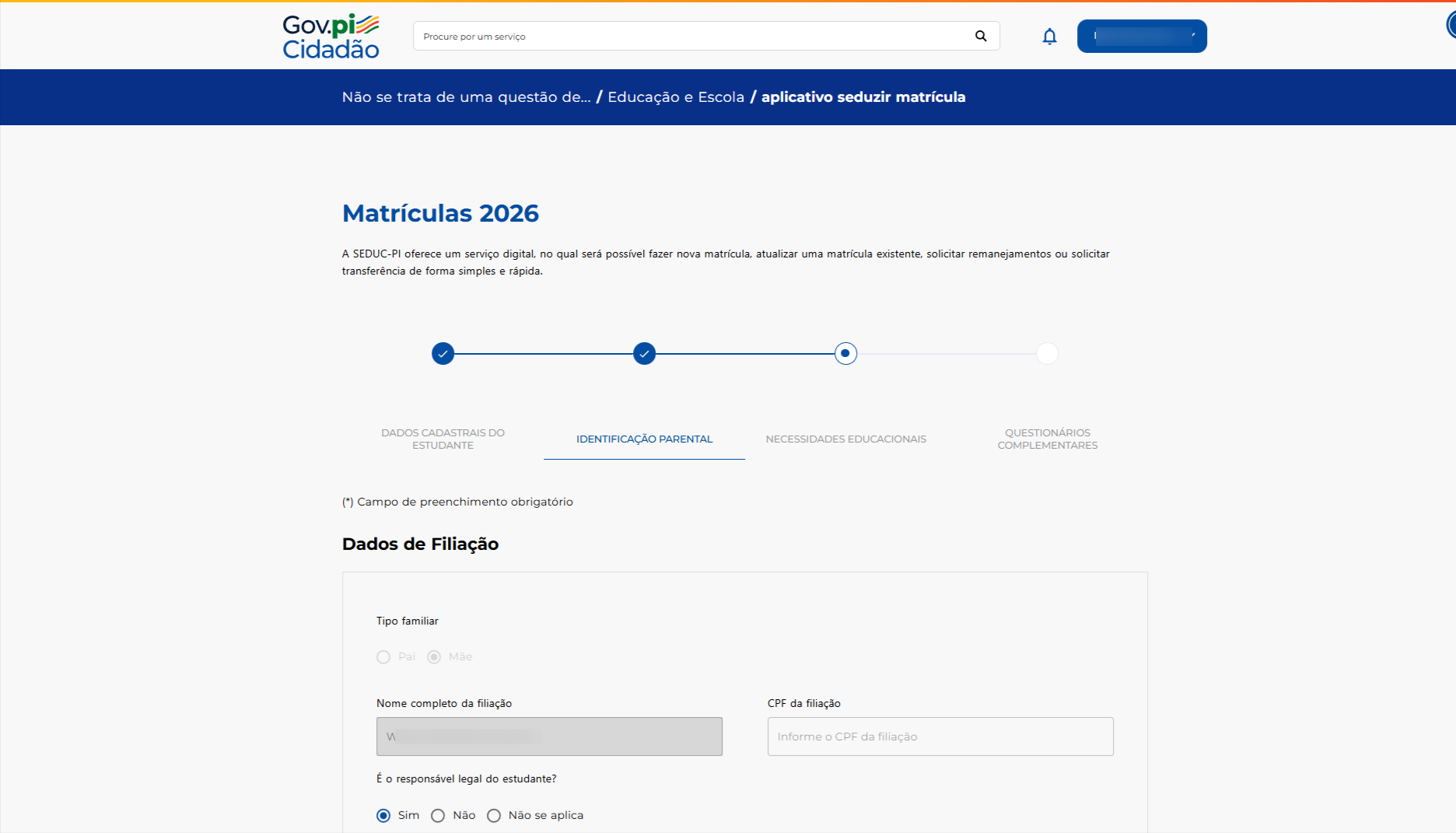 Se a filiação não for responsável pelo estudante (caso de menores), preencha o campo Responsável Legal.