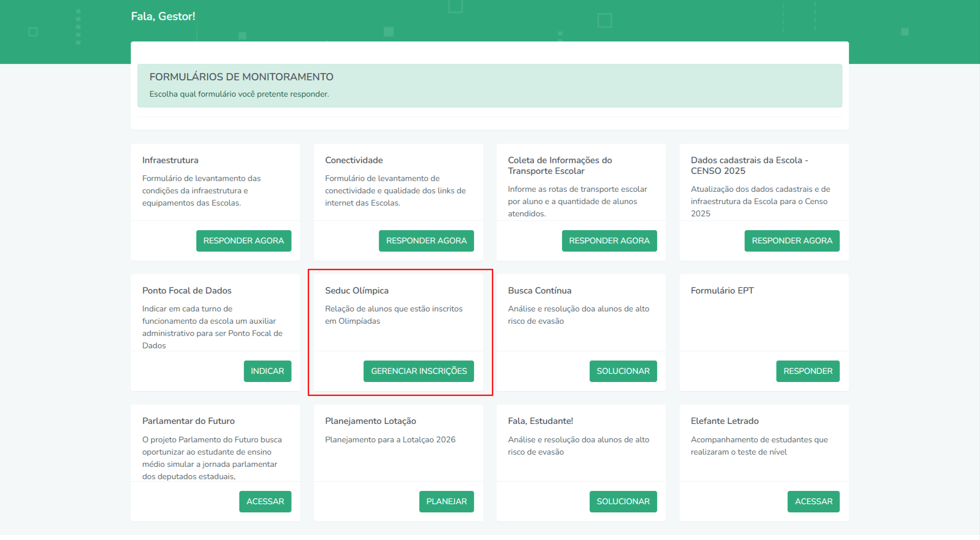 Na página inicial, localize o card SEDUC Olímpica e clique em “Gerenciar Inscrições”.