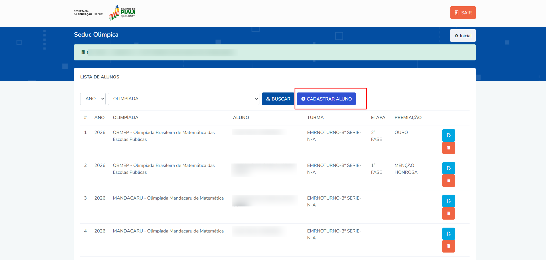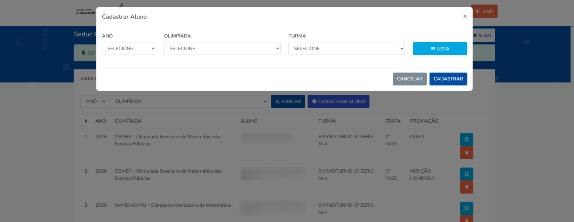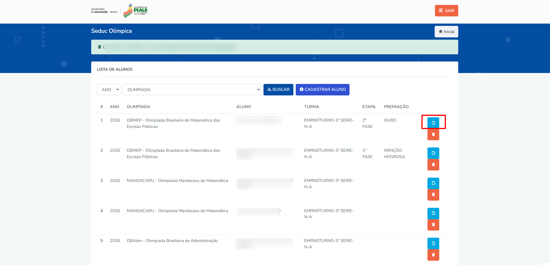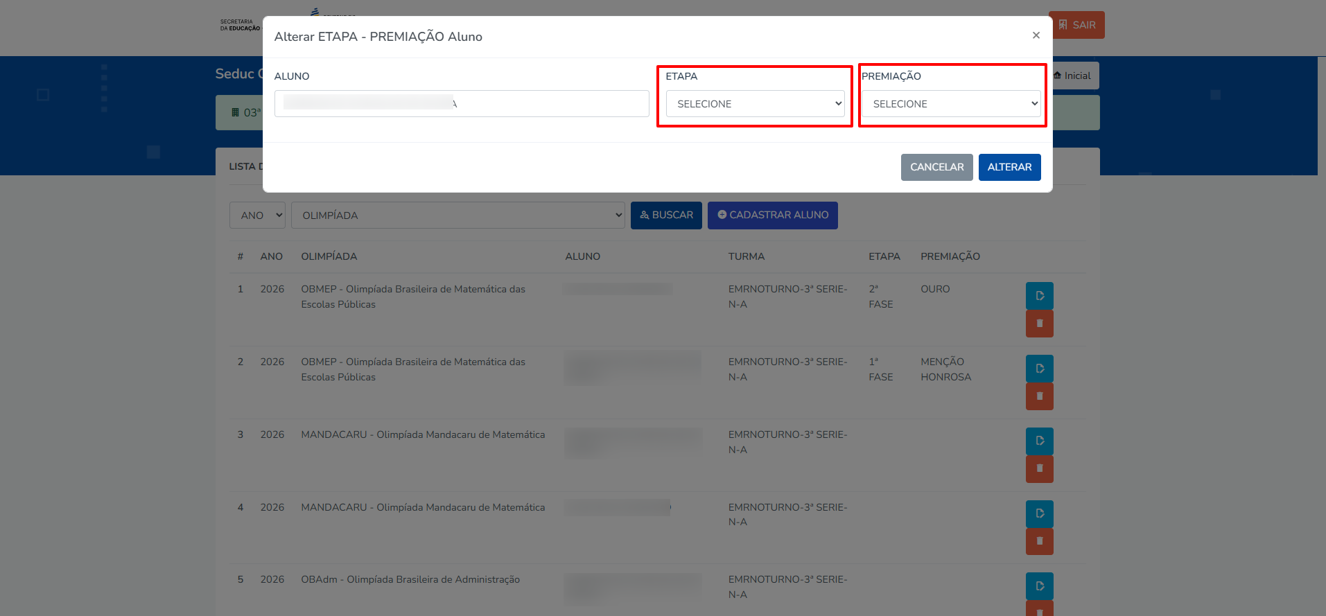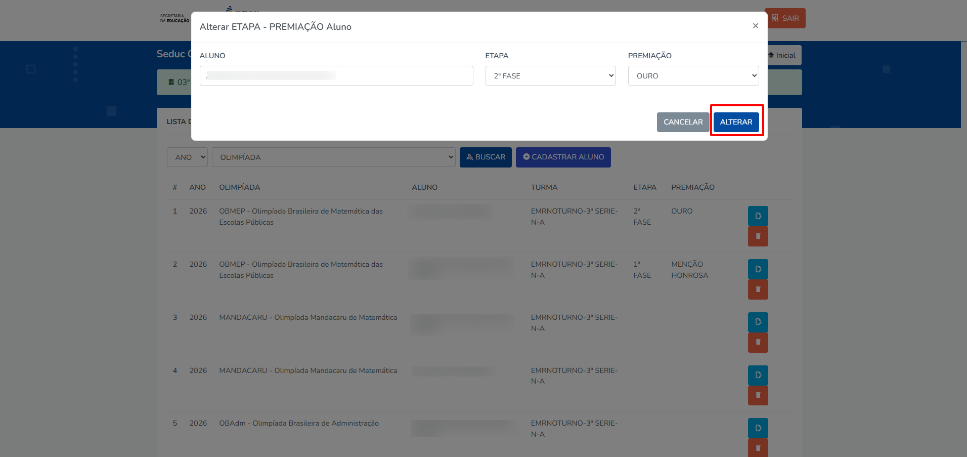 Na lista de alunos, clique no ícone azul de “Alterar Etapa/Premiação”.