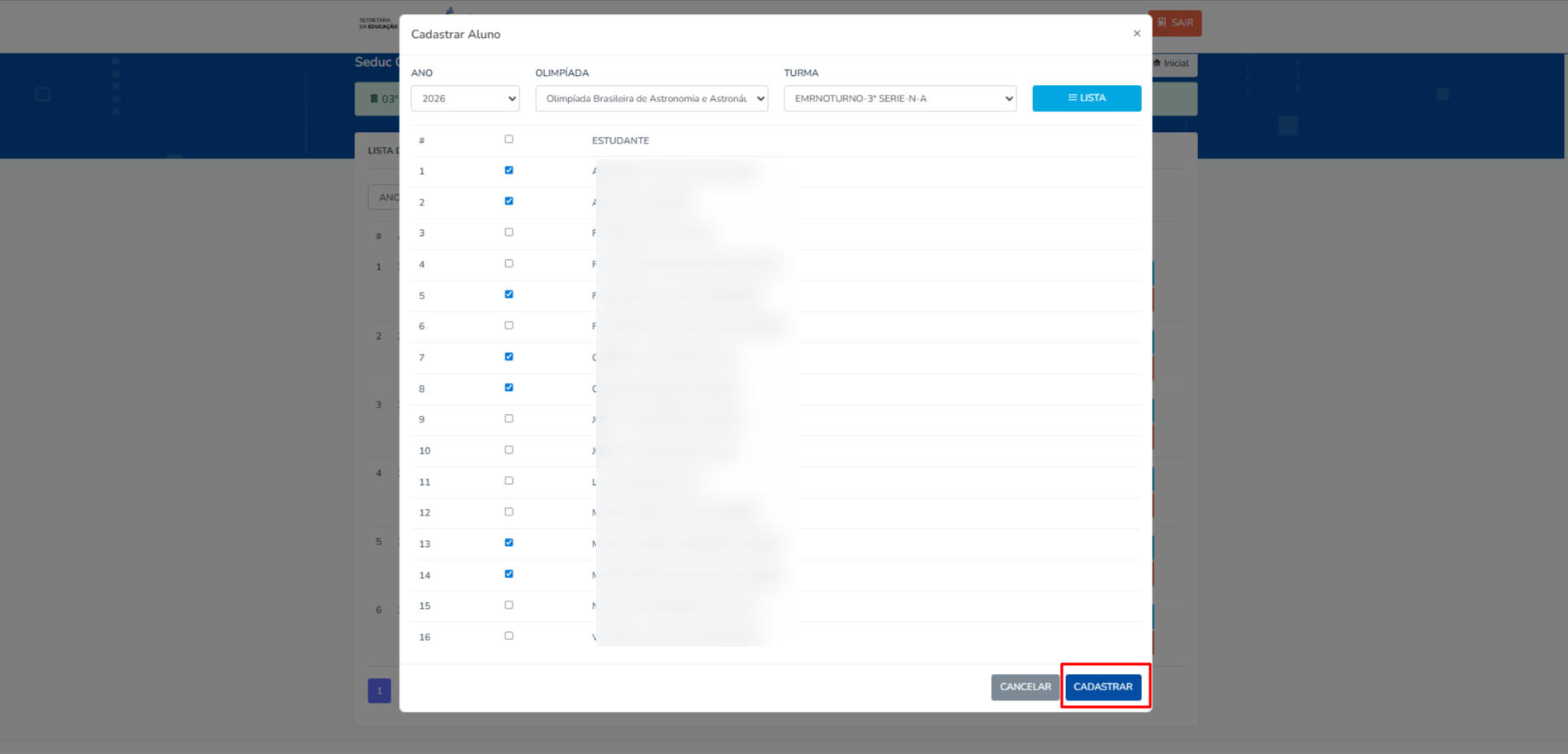 • Clique em “Listar” para selecionar os estudantes
