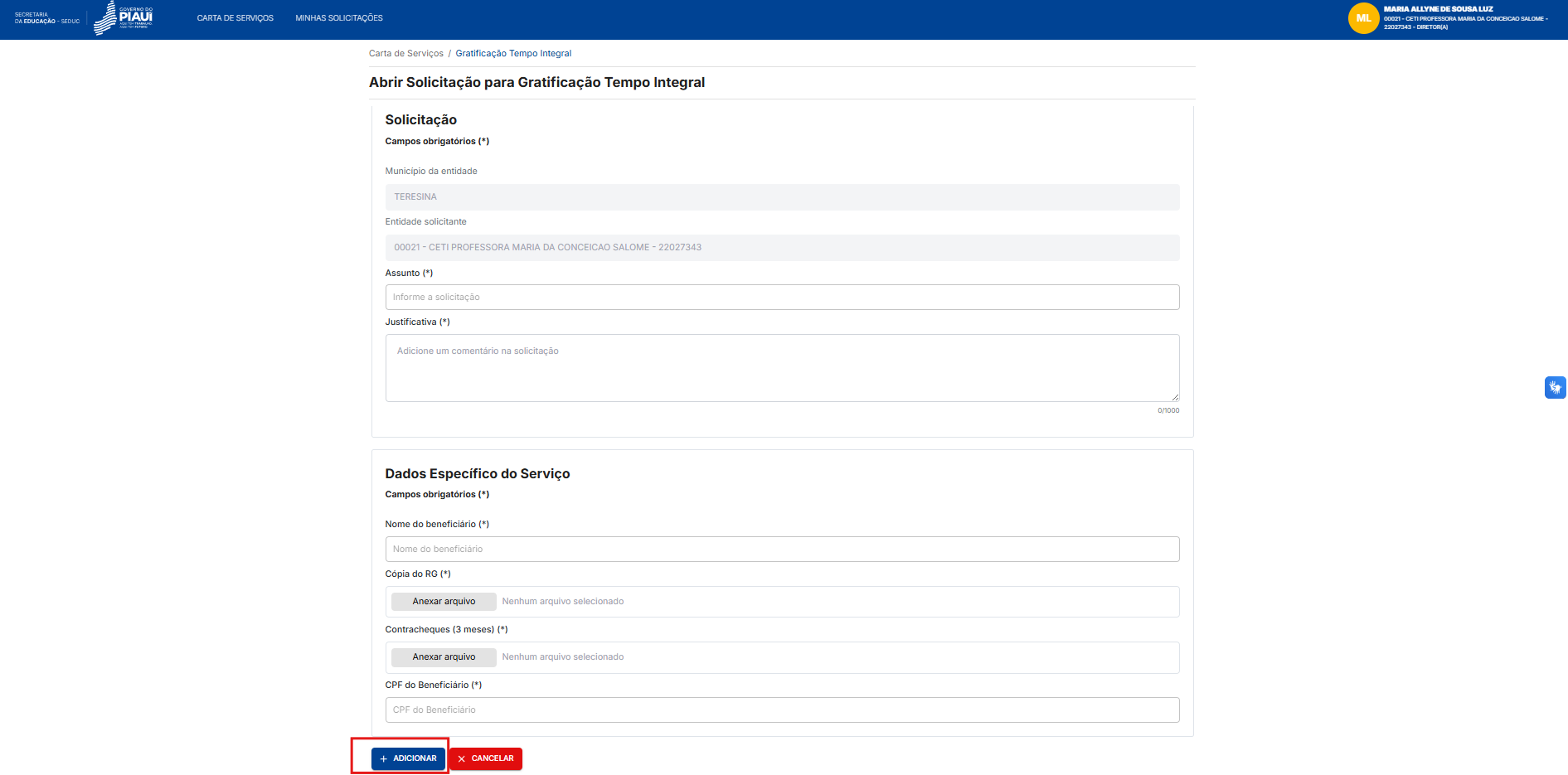 2. Ao abrir a página de solicitação, você encontrará um formulário com campos a serem preenchidos. Complete todos os campos obrigatórios com as informações solicitadas, como o assunto, justificativa, dados específicos do serviço e anexo.