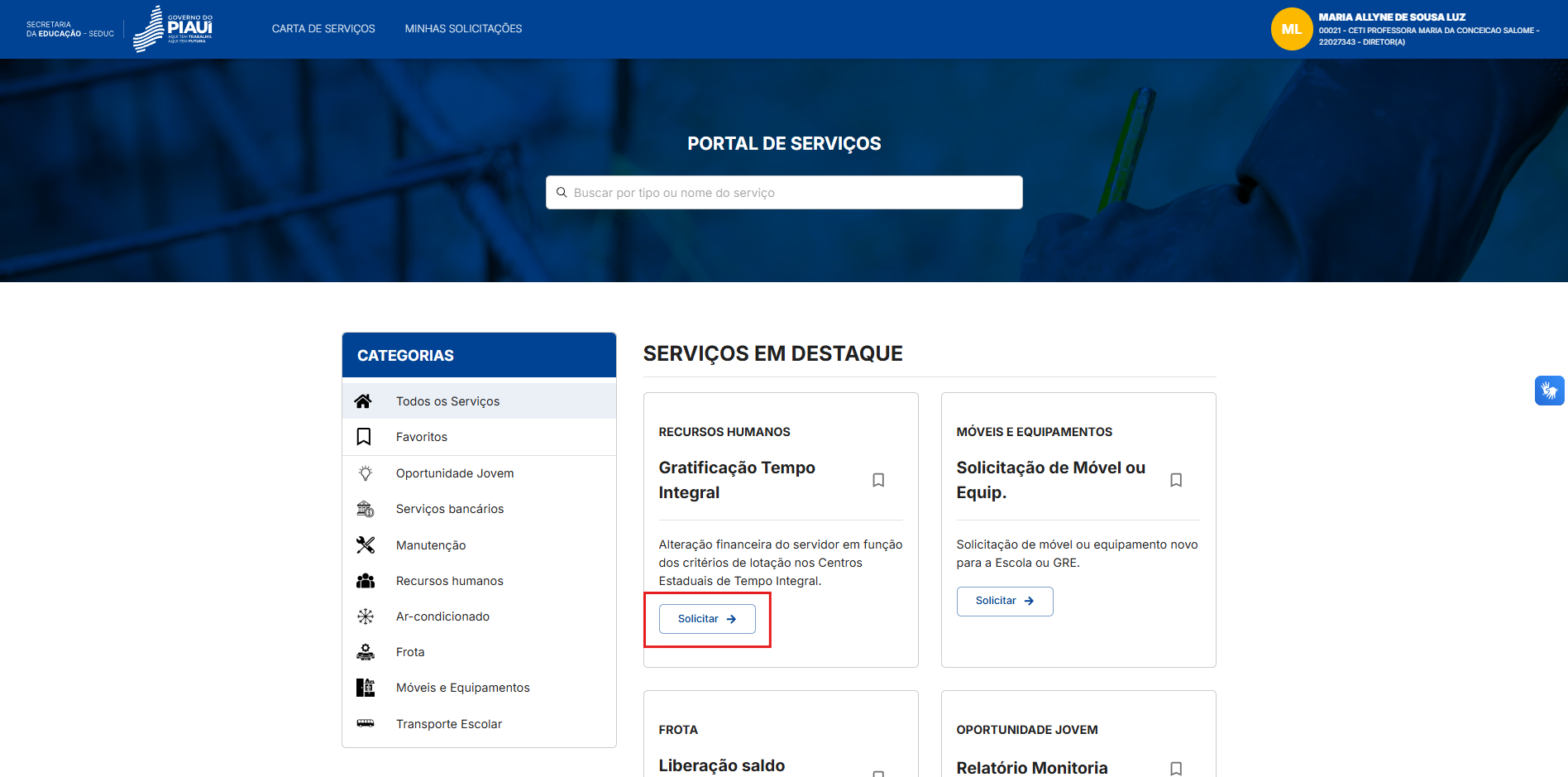 Utilize a barra de pesquisa para buscar o tipo de solicitação ou acesse todos os serviços na página inicial para encontrar o serviço desejado.