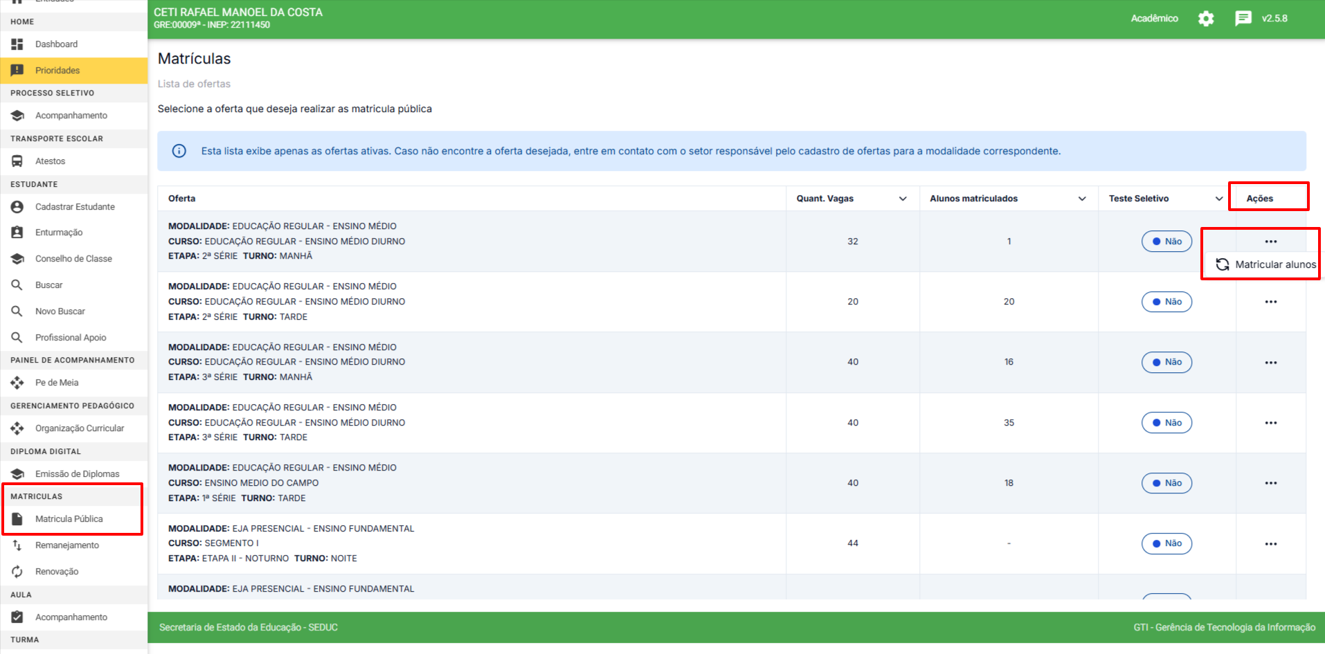 • Acesse: Matrícula > Matrícula Pública > Ações > Matricular Estudante > Nova Matrícula.