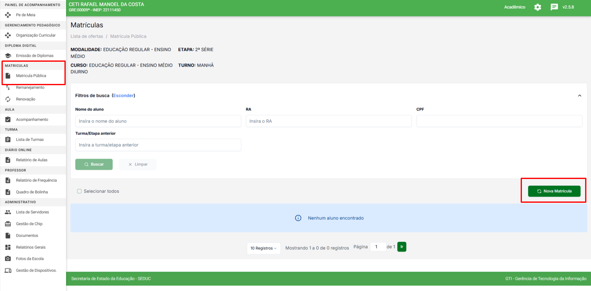 • Menu de Acesso: Matrícula > Matrícula Pública > Ações > Matricular Estudante > Nova Matrícula > Buscar