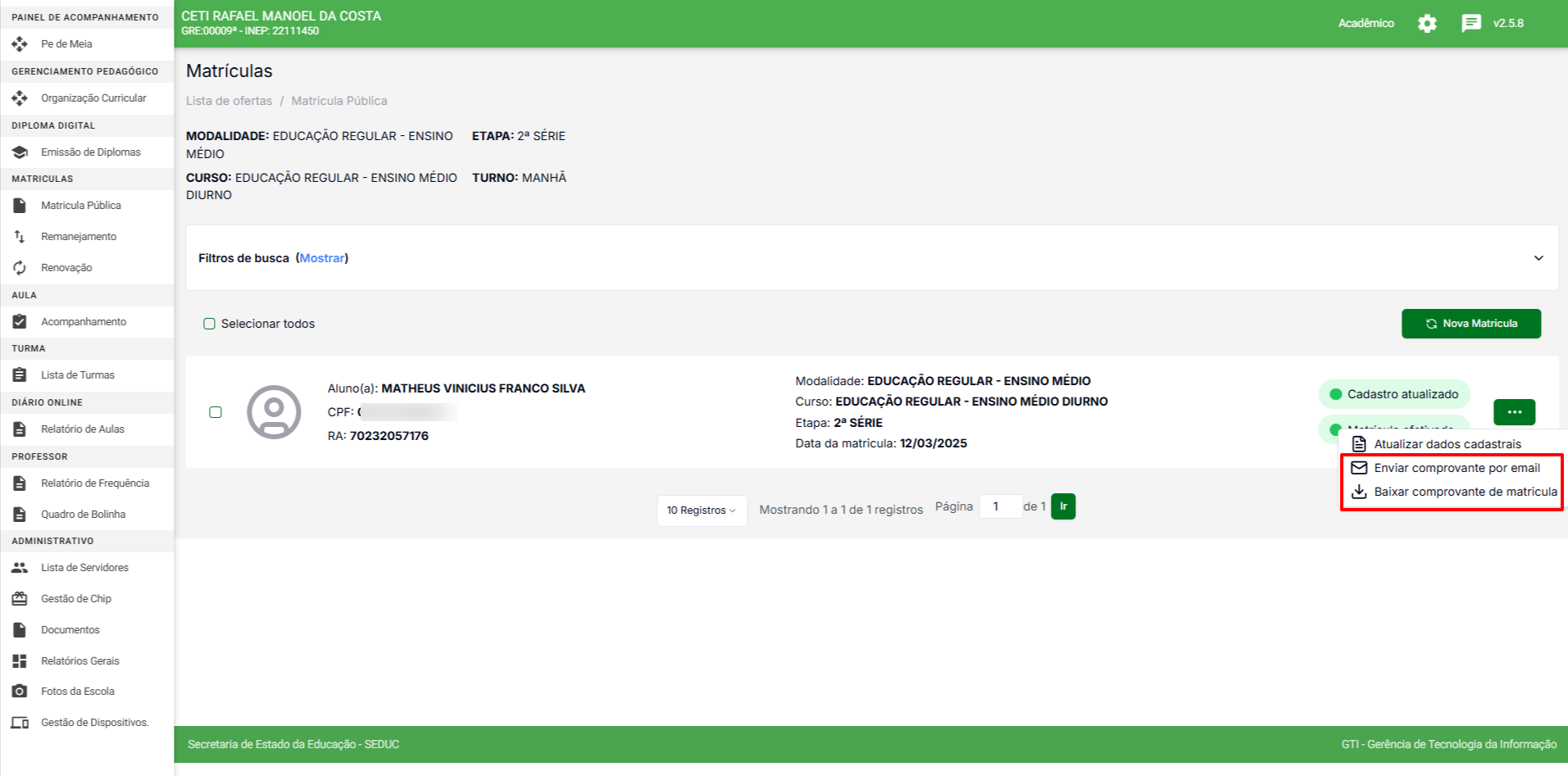 1. Emitir Comprovante de Aluno Já Matriculado: