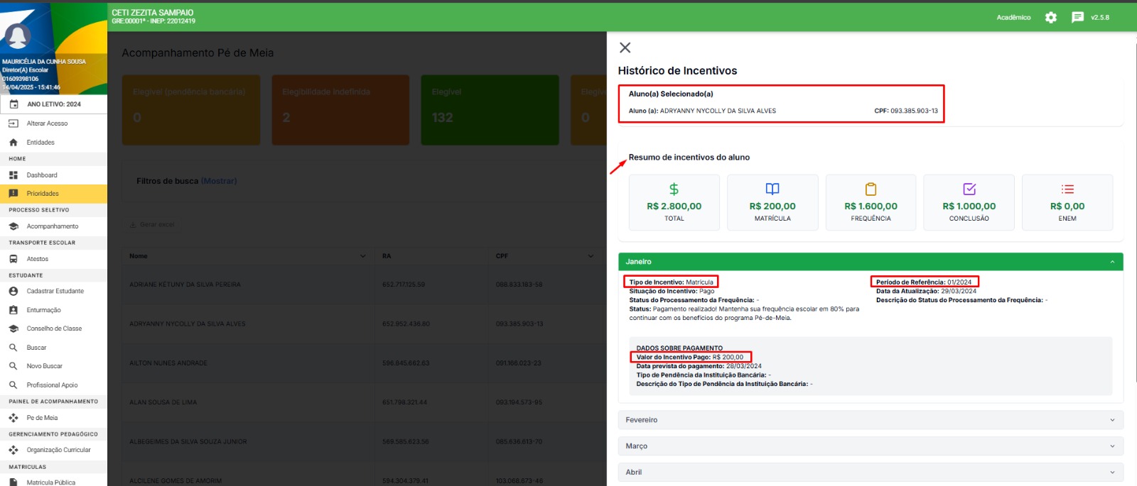 A Tela de Pagamento de Benefícios é uma funcionalidade que permite visualizar o histórico detalhado de incentivos pagos ao aluno.