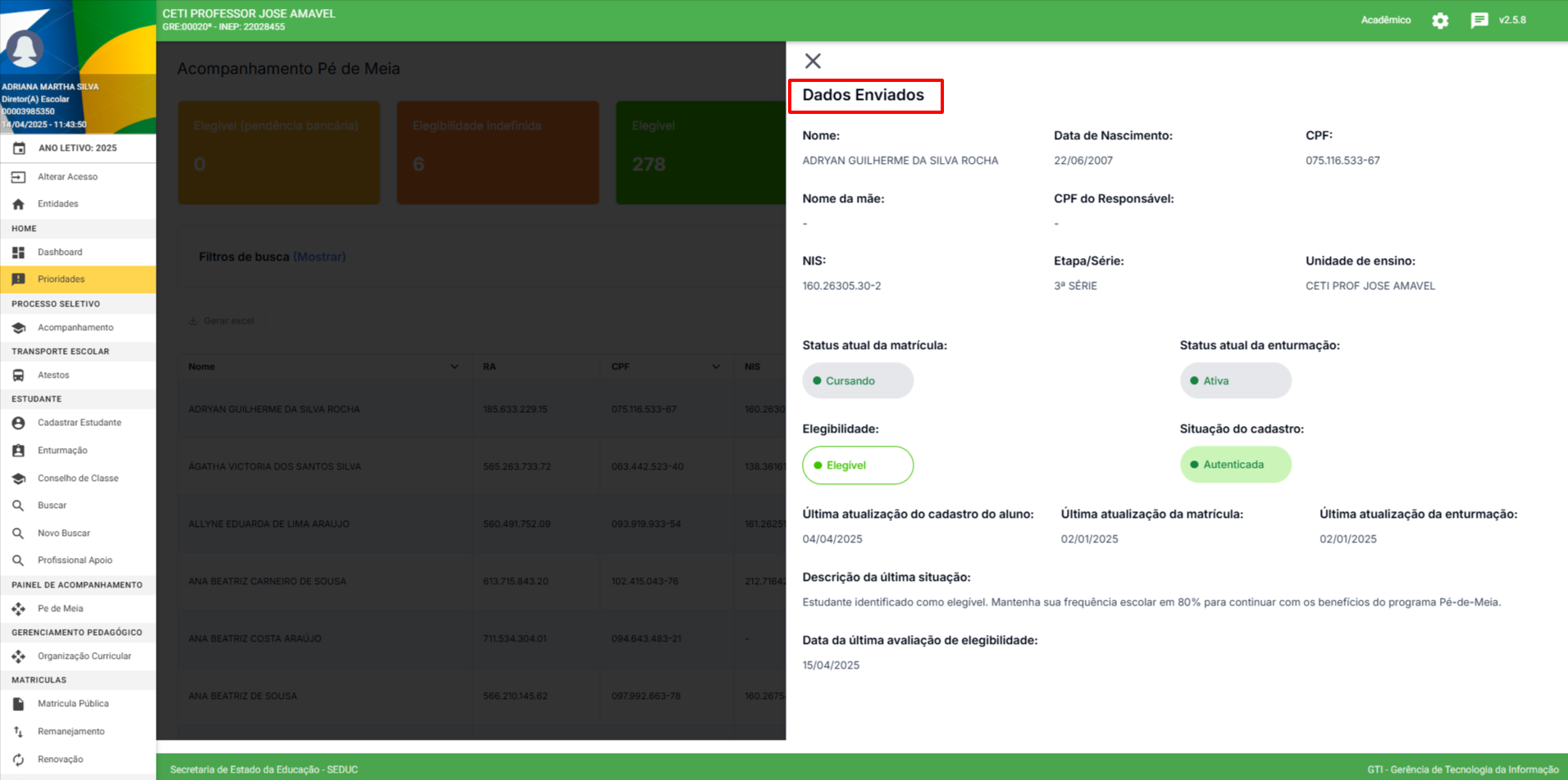 - Clique em Dados Enviados para visualizar os detalhes do cadastro do estudante.